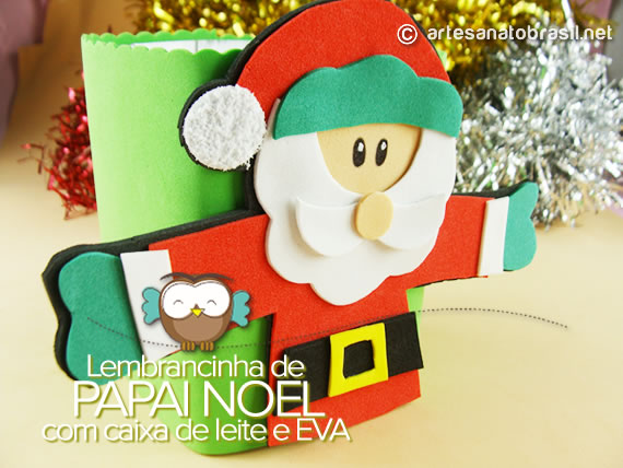 Pode-se fazer lembrancinhas e enfeites de natal usando além do EVA, materiais recicláveis como Garrafas Pests, caixas de leite e outros litros de vidro. São baratos e encontrados em casa. Sua lembrancinha vai ficar original e única.