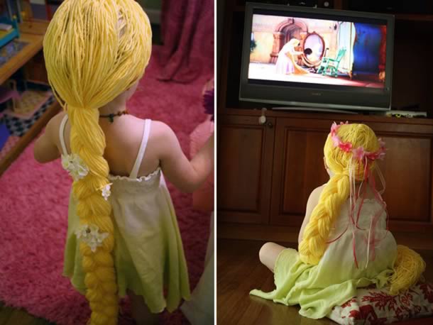 A Rapunzel é queridinha das meninas e para fazer uma fantasia dela é só usar um vestido e fazer uma peruca com trança bem grande de lãs.